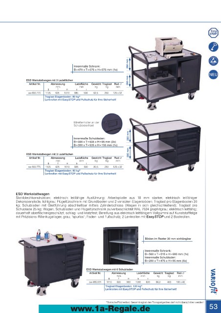 ESD Tischwagen mit 2 Ladeflächen und 2 Schubladen Artikel Nr. Abmessung Ladefläche Gewicht Traglast Rad ∅